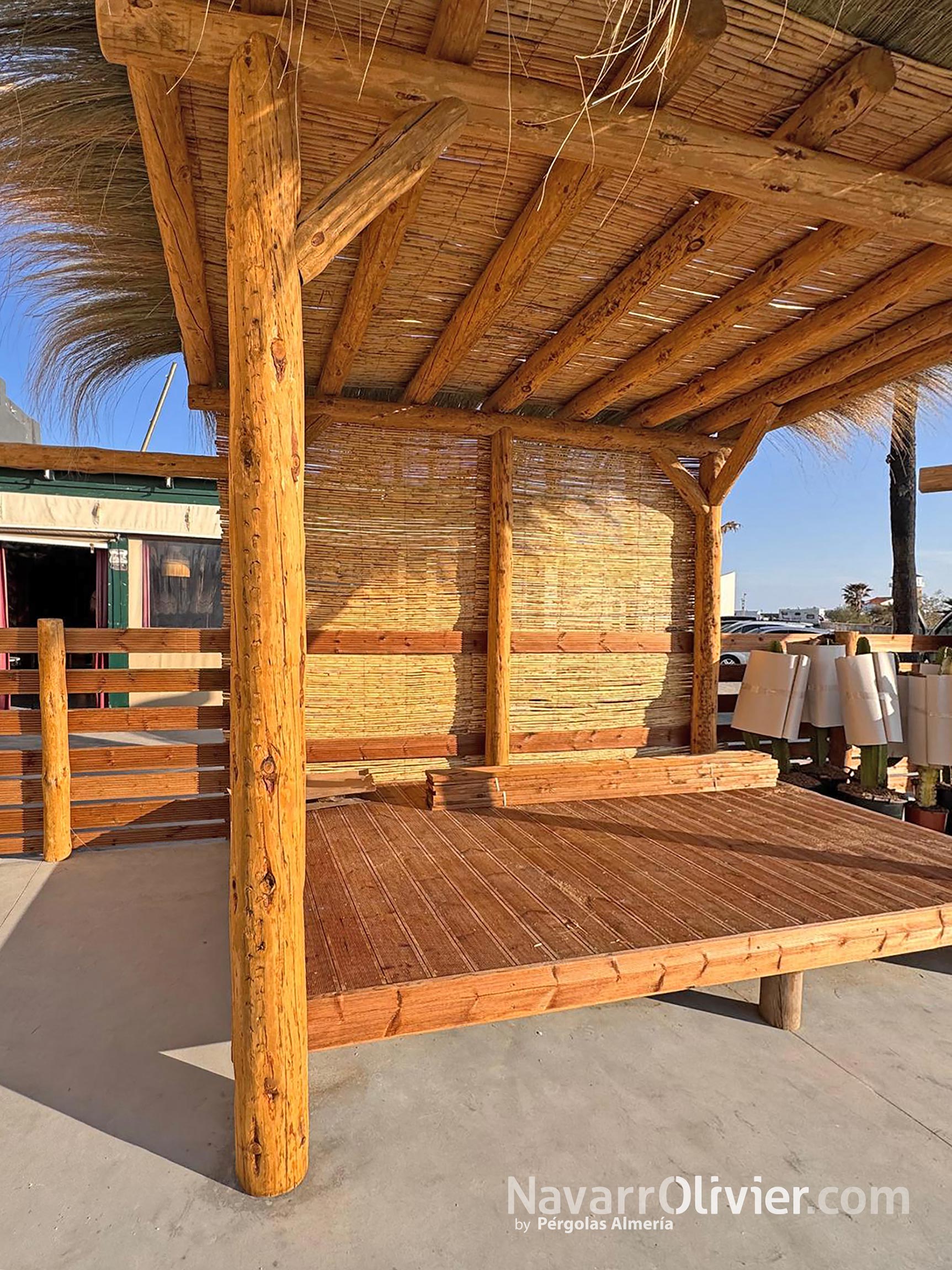 Siguiendo el estilo rústico construimos la tarima con cubierta de tronco, cañizo y carritx para la cabina del dj, además de un chiringuito modular modelo Campello de 10 m² equipado con instalación eléctrica preparado para dar servicio a la terraza de Playa Jaleo este local de ocio ideal para tardeos junto al mar ubicado en la playa de Almerimar, Costa de Almería.